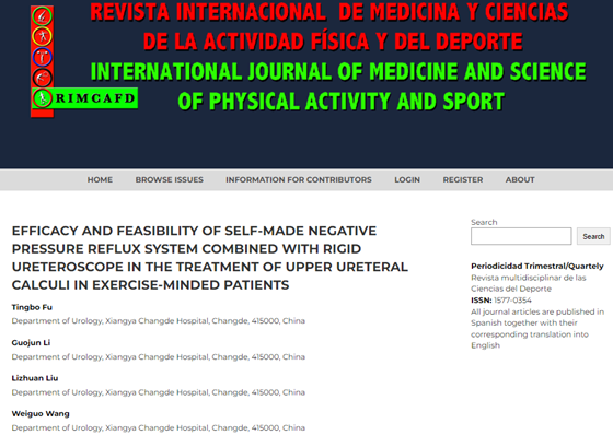 近日,湘雅常德医院泌尿外科团队一篇研究性论文在国际知名期刊《Revista Internacional de Medicinay Ciencias de la Actividad Fisicay del Deporte》(JCR 4区,IF:1.3)上发表,论文题目《Efficacy and feasibility of self-made negative pressure reflux system combined with rigid ureteroscope in the treatment of upper ureteral calculi in exercise-minded patients》,该论文的合著作者为湘雅常德医院泌尿外科临床医师,符庭波主治医师为第一作者,湘雅常德医院泌尿外科为第一署名单位。