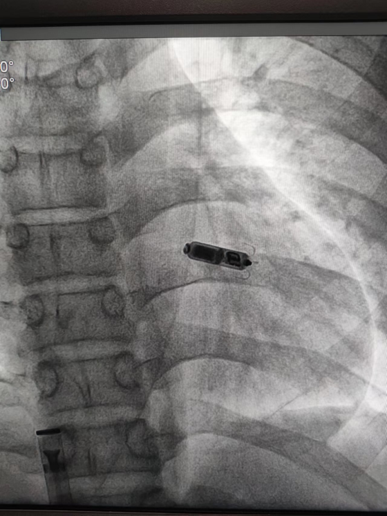 7月13日,患者在局麻下接受了无导线永久起搏器植入术,手术过程顺利,共历时40分钟,患者手术中无需切开缝合,微创方式即可植入起搏器,术后恢复良好,复查心电图起搏器工作良好。一周内安全出院。
