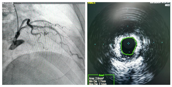 今年58岁的高大叔,5年前开始反复出现活动后胸闷气促,休息后可逐渐缓解。因症状逐渐加重,前来湘雅常德医院心血管内科门诊就诊,门诊医生了解高大叔症状,且有多年的高血压及糖尿病病史,考虑为冠心病,心绞痛。立即安排其住院,住院后完善对患者冠脉造影检查发现,前降支近-中段弥漫性狭窄30%-50%伴钙化,远段弥漫性狭窄50%-80%。进一步行IVUS检查可见前降支近段严重钙化病变,可见300°钙化。