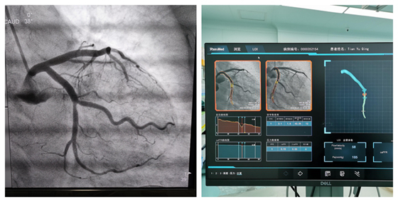 完善准备工作后,心血管内科医疗团队携手麻醉手术部进行FFR检查,经计算得出FFR值为0.95(>0.8),暂无支架植入指征,建议强化药物治疗。经强化药物治疗,患者病情平稳,未发作心绞痛。