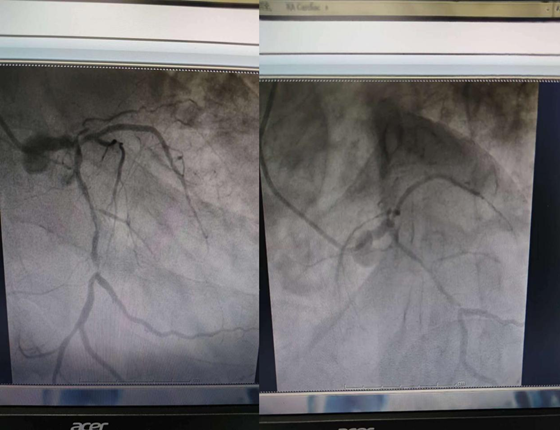 完善术前准备后,心血管内科主任彭道地、主任医师范爱德携手心脏介入团队经过长达数小时的手术时间,经过导丝反复尝试找到前降支血管真腔,严格按照PSP原则,于前降支及回旋支狭窄病变处植入药物洗脱支架覆盖病变。手术治疗过程顺利,没有出现夹层及冠脉穿孔等并发症。术后复查造影显示支架贴壁良好,支架内无狭窄,远端血流正常,手术顺利完成。术后病情平稳,顺利出院。择期行右冠PCI术。