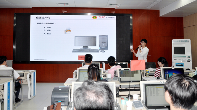 会上,网络信息中心工程师田戈首先利用PPT形式向来访人员介绍了我院整体软件模块,以及就桌面虚拟化、集成平台、住院护理电子病历、自动采血流水线、HRP、护理考核培训系统等方面做了详细的介绍。