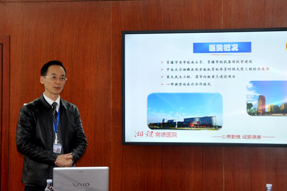 会上,沙新平副院长就湘雅常德医院的基本情况向来宾进行了简要的介绍,胡爱军书记就医院建设及内部装修向来宾进行了详细的讲解。