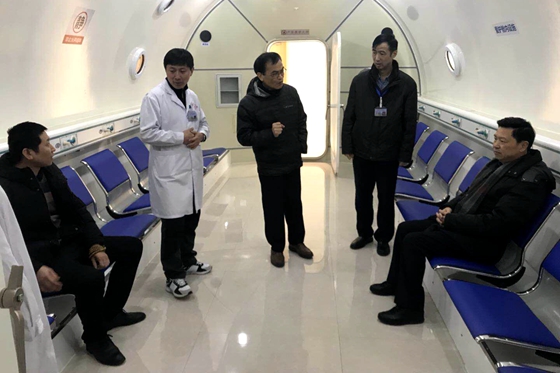 1月25日上午,我院高压氧科迎来了湖南省高压氧质控中心吴致德、肖平田等专家一行的验收检查。李远斌院长、邓天亮副院长、医务部黄炯主任进行了热情接待,高压氧科负责人陈忠红教授及全体医护人员、维修技术员一起陪同检查。
