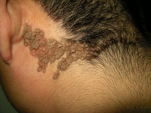 据介绍,疣状痣(Verrucous nevus)也称表皮痣、线状表皮痣等,一般在初生时或幼儿期发病,但也有10~20岁才出现,男女均可发病。通常表现为淡黄色至棕黑色疣体损害。其大小、形态及分布各有不同,大多呈乳头状隆起,排列成带状或线状或斑片状,全身各处均可发生,通常呈线状排列。发生于身体一侧。发生在男女生殖器和肛门及其周围的,此时,往往容易误诊为尖锐湿疣。
