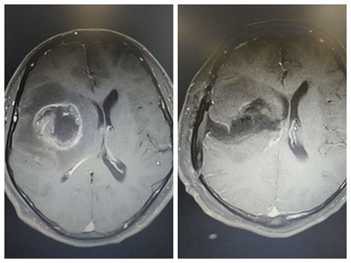 翦先生一直诉头痛得厉害,经检查发现病变位于右额叶内侧,周围脑组织水肿严重,颅内压力大,袁贤瑞教授建议马上手术治疗。