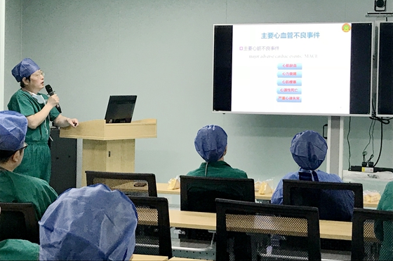 早上7:30,程教授早早的就来到了麻醉手术室,跟医务人员交流做麻醉的经验和心得体会,随后在麻醉手术部示教室就《非心脏手术围术期心肌梗塞》作了生动而富有卓见的精彩演讲。让在场医务人员更加客观的了解、评估麻醉中的许多危重情况,开阔了视野,拓展了临床思维。