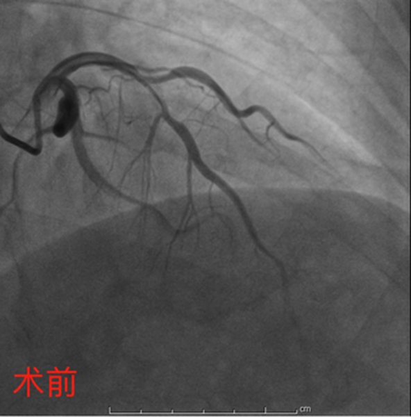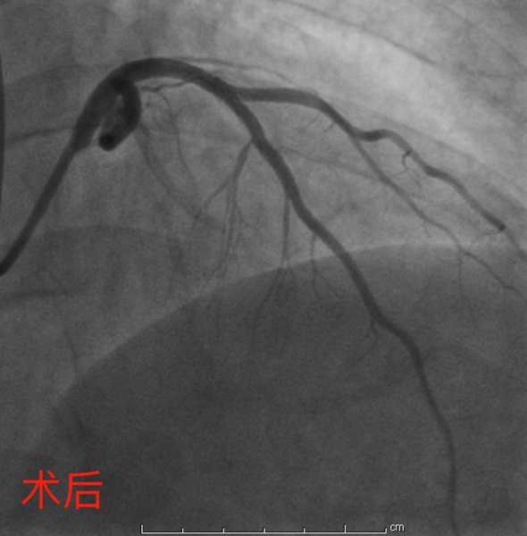 4月27日,彭道地主任与范爱德副主任医师为其手术。术中,冠脉造影提示:冠状动脉多支多处狭窄病变,其中左前降支近中段弥漫狭窄50-95%,第一对角支粗大,开口至近端狭窄75%-85%。“分叉狭窄病变”手术风险大、操作较复杂。但两位经验丰富的专家还是顺利将2枚支架植入狭窄血管,血管打通,病人病情得到明显缓解。
