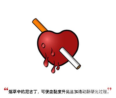 香烟中含有的尼古丁和一氧化碳随烟雾进入血液后可引起血管收缩、心跳加快,导致冠状动脉血管痉挛,进而引发心梗;另外,尼古丁还易引起血小板的黏附和闭塞,促使粥样硬化斑块的形成和增大,一旦斑块脱落,就会成为血栓,随时可能堵塞血管危及生命。