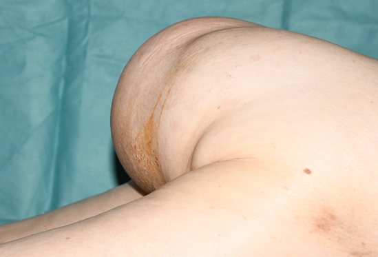 李老太来到湘雅常德医院整形美容烧伤科诊室时,坐都懒得坐,“坐着疼!”李老太不好意思地解释到,“我这是从小就有的毛病,现在大便也困难,睡觉也成问题,我已经好久都不能平躺了。怕是治不好了吧?”老太太再转过身,黄晓元教授便注意到了她臀部那颗“小皮球”,这就是导致老人家无法“落座”的原因。考虑为坐骨结节囊肿,大小约25cm*10cm。