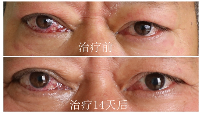 被诊断为甲亢、甲状腺相关性眼病的景大叔,眼球突出,眼部胀痛、干涩、畏光,结膜混合性充血,老感觉眼睛里有脏东西,眼泪止不住地流,手握手绢不停擦眼泪。手机也不看了,反正看不清上面的字。