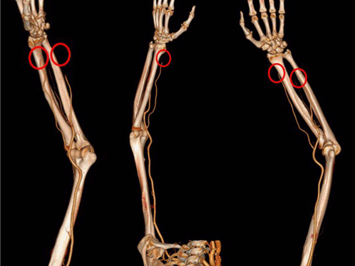 根据患者突发左手肿痛、冰凉,左手远段桡动脉及尺动脉脉搏减弱,心内科主任彭道地凭借其多年经验,考虑左上肢血管闭塞,病情较重,存在左上肢坏死及截肢可能。立即完善相关检查后发现,肌酶高、动脉CTA提示:尺桡动脉远段闭塞,部分掌部血管显影不佳。左上肢血管栓塞确诊无疑!