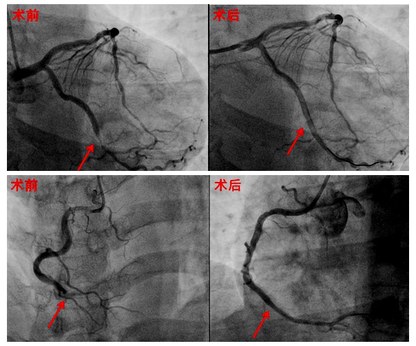 完善冠脉造影示:右冠动脉远段闭塞伴血栓影,回旋支近中段局限性狭窄90%,远段血流减慢。最终在右冠及回旋支病变处分别植入支架一枚,术后支架内未见残留狭窄,远端血流恢复。