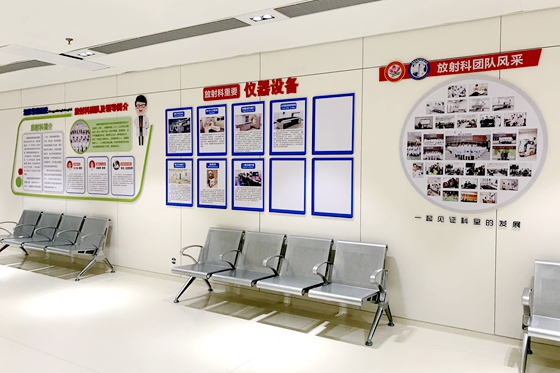 检查室门口的照片文字墙是以介绍科室领导团队、展示科室重要仪器设备、以及展示科室团队风采为主,其中对科室重要仪器设备的介绍能让患者在检查前对检查设备有一定的熟悉和了解,有利于舒缓紧张情绪,更好的配合医务人员完成检查。