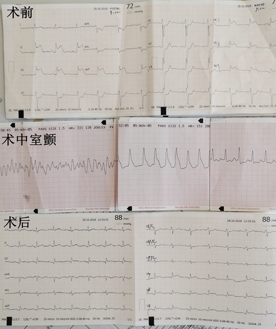 时间就是生命,心内科主任彭道地、范爱德副主任医师、龚辉医师、介入护士刘玲慧和刘秋蓉已准备就绪,患者被送入导管室。10:10,开始术前准备:心电监护、建立静脉通道……10:19,冠脉造影提示:前降支中远端弥漫性狭窄,回旋支近段狭窄99%、中远端完全闭塞。10:32球囊通过,罪犯血管血流恢复,患者立刻出现再灌注性心律失常,室速、室颤,马上除颤和抗心律失常药物治疗。医护团队迅速在回旋支病变处植入支架1枚,开通闭塞血管。但术后很快出现无复流、再次发生室颤,整个导管室开始紧张起来,彭道地主任及范爱德副主任医师凭借着多年的经验立即再次电除颤,并行冠脉内溶栓及补钾、补镁等积极治疗后,患者血压、心律逐渐恢复正常,胸痛消失。在导管室观察30分钟,患者的心电活动稳定,生命体征正常。11:10患者安返病房。