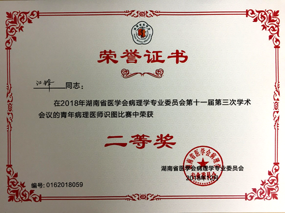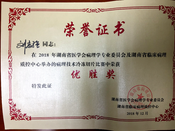 在“湖南省首届青年病理医师诊断识图比赛”中,湘雅医院病理科刘保安教授和湘雅常德医院病理科主任彭劲武担任现场评委,来自全省各大三级医院的60余位青年病理医师参赛。比赛采用现场识图直答、抢答等新颖多样的方式,现场高手过招、角逐激烈。我院病理科江锋医师在“青年病理医师诊断识图大赛”上,在全省各大医院优秀的青年医师中突出重围,以初赛并列最高分的成绩脱颖而出,进入决赛,并最终取得二等奖的优异成绩(本次大赛共设一等奖2名,二等奖4名,三等奖5名)。刘志强技师在“病理技师冰冻切片比赛”中沉着发挥,亦获得了优胜奖的好成绩。