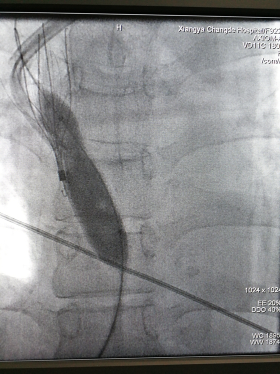 成小苗主任介绍,这是湘雅常德医院肾内科和介入科再合作成功的病例。目前肾内科和介入合作解决疑难血管通路病人有6例,包括颈内静脉狭窄,头臂静脉狭窄,颈内静脉血栓形成等导管功能不良的病人,通过采用球囊扩张,静脉支架,静脉滤器等方法,再顺利置入长期管,延长了尿毒症病人的生命线。