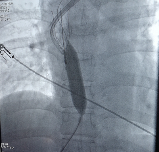 住院后给患者行CTV显示:右侧锁骨下静脉,右侧头臂静脉,上腔静脉上部充盈缺损,右侧颈内静脉启始部血栓形成。另外上腔静脉入口至右心房处有静脉狭窄。这就意味着,患者上述多处静脉有血栓,还有上腔静脉狭窄。如果贸然拔出右侧长期管,一旦血栓脱落随血而行,可能导致肺梗死或脑血栓,导致生命危险。成小苗主任、党智杰主治和介入科胡康新主任带领的团队汤金城主治医师,李毅副主任医师,黄彬副主任医师介入团队一同仔细分析了病情。认为可以采取左侧颈静脉置入长期导管,右侧上腔静脉放置静脉滤器防治血栓脱落,拔出右侧颈静脉长期管,球囊扩张狭窄的上腔静脉这种方案,这样既解决了血栓脱落问题,也建立了新的血管通路。2月18日,肾内科和介入科血管通路学组成功为患者置入左侧颈静脉长期管,上腔静脉放置滤器后拔出右侧颈静脉长期管,术后病人颜面浮肿消退。胡康新教授指出,静脉滤器的放置,有效的解决了血栓脱落的问题,是介入科和临床学科合作成功的范例,为病人的治疗提供一个新思路。