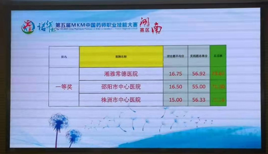 3月1日,由中国健康促进基金会(医药知识管理专项基金)主办、湖南省药学会医院药学专业委员会和湖南省健康管理协会安全合理用药专业委员会共同承办的“诺华杯”第五届MKM中国药师职业技能大赛湖南赛区晋级赛在中南大学湘雅医院举办。湘雅常德医院药剂科通过首届“湘雅常德医院药师职业技能大赛”获奖选手中选拔出佼佼者——胡超和陈友姣两位药师参赛,由肖幸华主任领队。经过先后两轮激烈角逐,我院药剂科代表队从本次晋级赛中的24支参赛队伍中脱颖而出,一举夺魁!