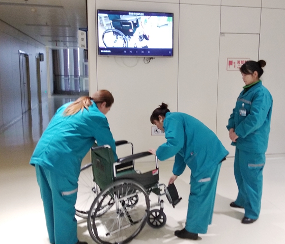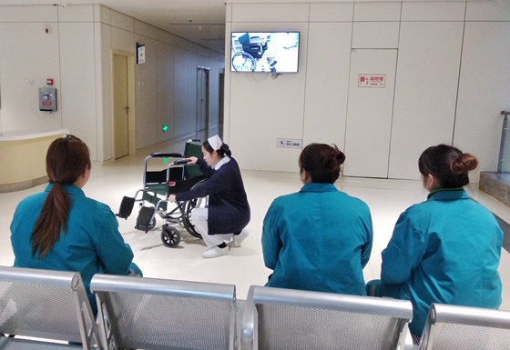 培训人员通过观看视频,随后接受护士的一对一专业指导,针对轮椅的折叠、展开、使用、固定、轮椅的上坡、下坡等注意事项,门诊部护士将专业化知识细化传达给了所有陪检人员,参训人员纷纷表示受益匪浅。
