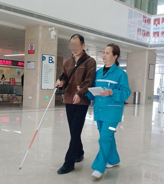 5月8日上午8点多,伴着“哒哒哒”敲击地面的节奏声,一位盲人患者来到了湘雅常德医院。陪检薛阿姨看见后,立马主动上前搀扶住他。经过询问得知,该病人没有家属陪同,独自一人坐公交来医院看病。考虑到患者行动不便,薛阿姨便亲自陪同患者去往就诊科室。薛阿姨把患者的手搭在自己肩上,俩人一前一后地向前走。