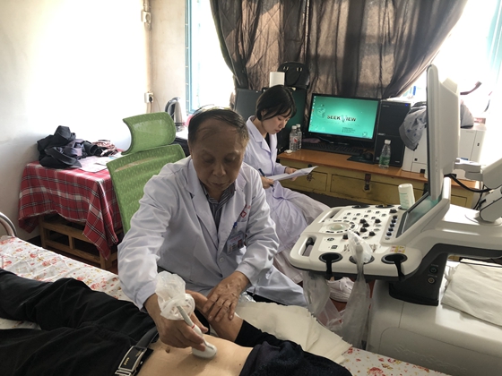 黄铁汉主任医师及丁慧医师做腹部B超检查