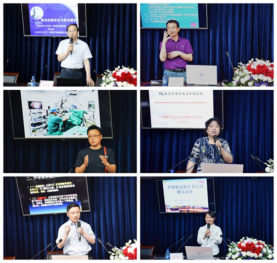会上,黄永望教授作“嗓音疾病的评估与矫正”的主题讲座,于细微处发觉了“嗓音”学科的魅力,引起了学科同仁的重视;王行炜副教授所作“CO2激光显微外科技术治疗早期声门癌”,详细讲解了CO2激光治疗早期声带癌适应征和手术方法;张帅副教授所作“喉显微手术的基本要素”,强调了喉显微手术的重要性和优势,以及如何正确使用CO2激光;田湘娥教授所作“CO2激光在嗓音疾病中的应用”主题讲座,提到了激光的发展,激光在咽喉手术中应用的发展,CO2激光在嗓音疾病中的应用范围;黄东海副教授的“声带麻痹的诊断及治疗”专题讲座,详尽阐述了单侧及双侧声带麻痹的诊断方法,声带麻痹的各种治疗方式以及治疗效果;郭莹语言治疗师现场演示了显微手术后的嗓音训练。精彩的学术讲座与现场示范受到听众的掌声阵阵,大家都表示不虚此行。