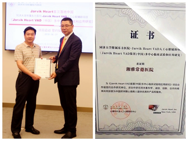 湘雅常德医院被确定为该项目全国首批28家临床应用单位之一,湖南仅3家医院为首批合作医院。湘雅常德医院心胸外科黄日茂主任被上海同济大学附属东方医院人工心脏研究中心聘为该项目子课题负责人,将为湘西北地区终末期心衰患者提供国际上最先进的医疗技术和服务。