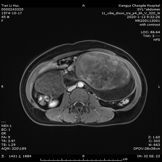 田阿姨住院后,立即引起了全科的高度重视,主管医生对她进行了详细检查。通过CT、MRI检查结果分析,初步判断为一种罕见的腹膜后巨大脂肪肉瘤,且左右侧腹部各一个,较大者约22*21厘米。在科室主任肖广发教授的组织下,黎有典主任医师、刘冬保主任医师、曾虎副主任医师、聂云贵主治医师等全体医生对田阿姨的病情进行了认真讨论,并制订了详尽的手术计划,随时做好联合脏器切除重建准备。