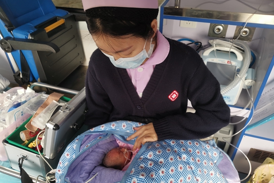 转运途中,医护人员一刻不敢松懈,全程密切监测患儿生命体征,将转诊途中的危险降到最低。最后,护士曾亚把宝宝安全护送到了保温箱。