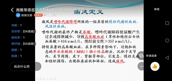本次科内业务学习由陈前药师在线直播讲解《痛风的药物治疗》,围绕痛风治疗进行药物介绍,倡导安全合理使用降尿酸药物,建议痛风患者平日应“管住嘴、减体重、多饮水、勤运动”;代佳药师讲解《儿童身高管理小知识》的内容,囊括了生长规律及影响因素、矮身材病因及诊断流程、生长激素的应用等方面的知识,她讲到接受生长激素治疗的患者应定期在门诊监测有效性和安全性指标,遵循个体化治疗原则,采用早治疗、足剂量和长疗程的方法。讲解完毕后,药剂科群里提问不断,掀起了一股讨论学习的热潮。