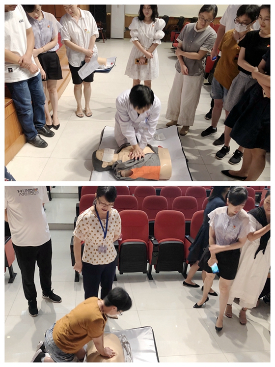 何青春副教授以授课和实际操作相结合的方式让培训人员对“心肺复苏”基本知识、溺水的急救措施以及海姆立克急救法有了深刻的认识。随后,培训讲师逐一进行“心肺复苏”的实操练习,当有按压体位不对、按压手法不到位等问题出现时,医务人员便立即指出并现场演示规范化操作。整个活动持续两个多小时,目的是将理论与实践相结合,让大家身临其境的感受争分夺秒的抢救现场,以加深对心肺复苏全过程的了解与掌握。