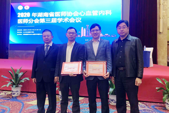 2020月31日-11月1日,由湖南省医师协会心血管内科医师分会主办的“2020湖南省医师协会心血管内科医师分会第三届学术会议”在长沙盛大召开。来自全国及省内心血管领域及相关领域专家,为参会同道带来学术盛宴。大会通过学术报告、病例讨论等方式,与心血管领域同道们积极交流。 湘雅常德医院心血管内科由彭道地主任和范爱德主任医师率科室医生、心电图室技师参加此次会议,并且彭道地主任担任会议中相关学术专题的主持人。 本次大会,湘雅常德医院心血管内科积极参与冠心病、心内电生理、疑难病例讨论等新进展和热点问题的专题学术讲座,会场学术交流气氛热烈。湖南省医师协会为范爱德主任医师颁发“抗疫英雄”荣誉证书。期间,大会授牌成立了湖南省心电图及心律失常诊断联盟,心电图室黄伊濛技师受邀成为联盟委员。