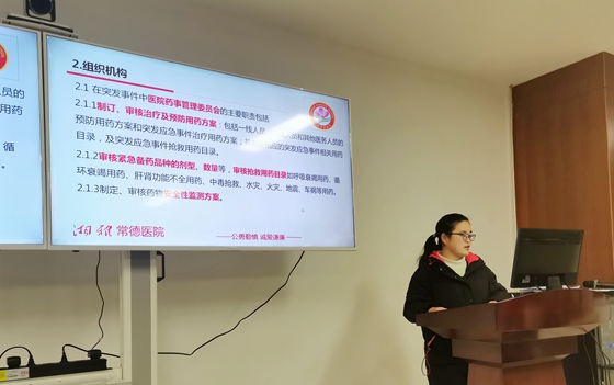 培训会上,陈友姣药师首先介绍了“突发性紧急事件的预警系统”的定义及启动时机,随后逐一说明了医院药事管理委员会以及药剂科下设的人力资源组、药品保障供应组、药品调剂组、临床药师组、药品质量控制组5个专业职能组在突发性紧急事件药事管理中的主要职责划分和工作注意事项。详细地阐述了突发事件发生时的事件的上报、相应预案的启动、人员的调动、组织协调、事件的高效快速的处置流程、事后的总结分析等内容。