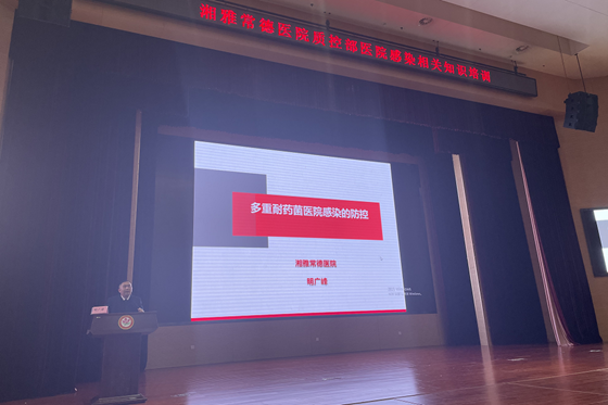4月27日,湘雅常德医院质控部开展“多重耐药菌医院感染的防控”、“血源性职业暴露的预防及处理”为主题的相关知识培训,本次培训旨在加强湘雅常德医院多重耐药菌感染防控工作,使全院医务人员都掌握多重耐药菌的相关知识,提高多重耐药菌的诊断、监测、预防和控制等技术水平,强化医护人员对多重耐药菌的防控意识,以及学习职业暴露的相关概念,掌握职业暴露的预防及处理流程。湘雅常德医院副院长沙新平及全院所有非值班医护人员参加培训,重症医学科主任明广峰担任此次培训讲师。