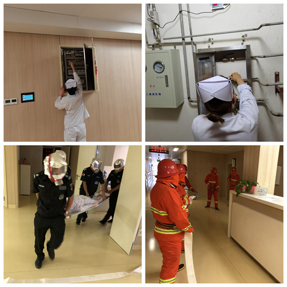 上午八点三十分演练开始,二号楼肾病内科护士站因电线短路引发火灾,值班护士发现火情后积极组织第一现场灭火和人员疏散,但现场火势迅速蔓延,科室无法继续控制火势。中控室值班员接到报警后,迅速启动该楼层排烟系统,并立即通知医院安全保卫部值班人员。安全保卫部接到通知后按照医院的消防应急预案安排,灭火行动组负责对室内火灾现场进行扑救及着火楼层外墙降温处理;疏散引导组负责对科室人员进行疏散引导;警戒组负责划定火灾现场的警戒区域进行封锁,保证火灾现场无关人员不得进入。在整个过程中各班组响应迅速、分工明确。