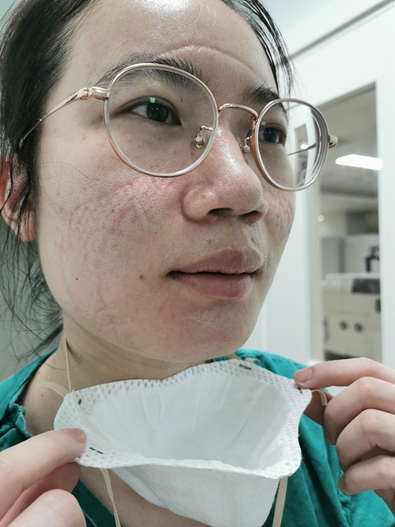 为了尽快出具检测报告,检验人员身着全副武装的防护服,在密闭的实验室内一待就是8个多小时,再加上工作时精神高度紧张,几个小时下来,眼眶、额头全是口罩带的勒痕,防护服里的衣服全部浸透,双手在汗水的浸泡下泛白起皱。