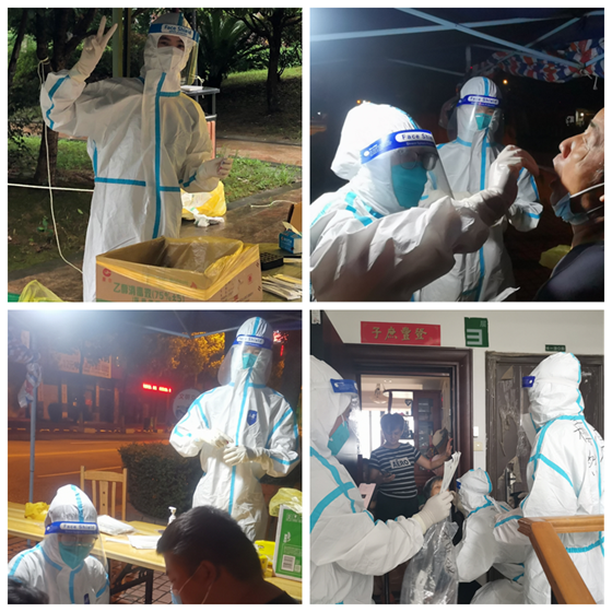 第三天我们来到的是稍远的一条街道,下午六点左右我们六个小组全部出发,到晚上十二点多才回到酒店,每个小组采集任务大概是七八百人左右。虽然天气没那么炎热,但是大家的衣裤早已湿透,面屏也模糊不清,可见前段时间高温情况下采集核酸是多么的不容易啊!夜里采集核酸光线没那么充足,一位老爷爷拿着手电筒为我们大概举了一个多小时,他说我们就是他们的救命恩人!每一位前来采样的居民都会礼貌地说上一句谢谢!辛苦了!还有人看到我们是常德来的支援队也会主动前来寒暄两句,这让身处异地的我们感到格外亲切,心连心,一家亲!这就是最好的诠释。