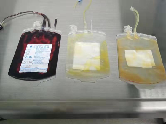 分离后的血液成分,最右为富血小板血浆(PRP)