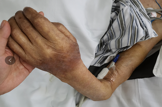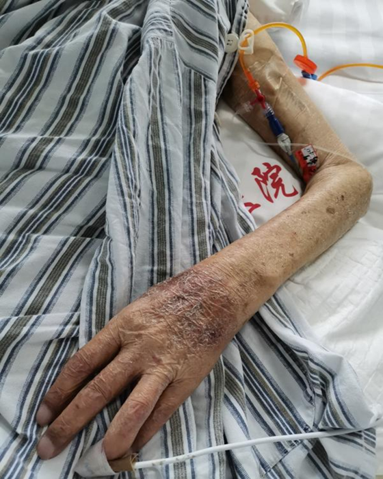患者张爷爷今年90岁,ICU转入时就是一名重症肺炎合并Ⅱ型呼吸衰竭和电解质紊乱的高龄患者,因脑梗塞后遗症长期卧床不起,导致患者极度消瘦、肢体挛缩、外周血管条件极差,此次患者病情危重输液量大,且输注药物刺激性强,给临床治疗和护理带来极大的困扰。