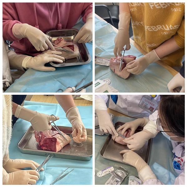 彭红婴老师从“缝针的间距、器械的合理使用、粘膜层切口边缘对合、肌肉筋膜层正确对合、皮肤缝合、外观对合整齐、时间控制、整体操作熟练程度”八个方面来对学员进行培训,通过在牛舌上的实操练习,年轻医生及助产士们对会阴缝合速度、进针技巧、打结技巧、伤口对合情况、缝合美观程度、人文关怀等方面都得到了很大程度的提高。授课结束后,各小组分别进行现场牛舌缝合模拟练习。