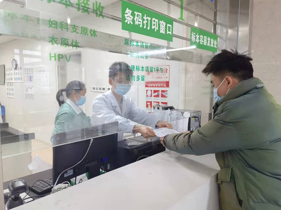 追踪患者来到门诊采血室,因自动采血流水线设备故障,采血护士手工打印条码和包管后,为患者进行采血,随后引导患者前往检验窗口领取尿常规和大便常规试管。患者进行尿常规和大便常规的取样后,将标本交到检验窗口。