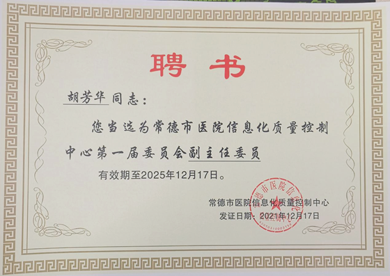 按照国家政府进一步重视并大力推进医疗卫生信息化建设的总体政策,根据《湖南省地级市医院信息化质控中心遴选工作》通知要求,在常德市卫生健康委医政处的指导下,近期,常德市医院信息化质量控制中心成立大会暨常德市医院信息化学术交流会顺利召开。来自市、县二级以上医院分管信息院领导、信息中心负责人等50余人应邀参加会议。我院网络信息中心主任胡芳华受邀参加会议并在会议中被任命为常德市医院信息化质量控制中心第一届委员会副主任委员。
