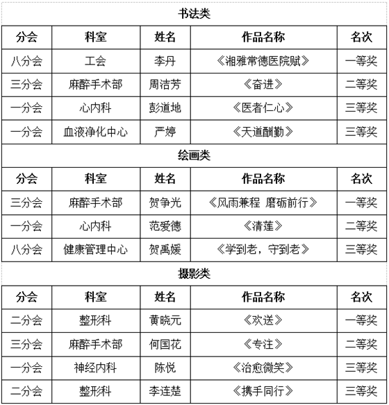 据悉,11月4日,院工会特别邀请常德市书法家协会、常德市美术协会几位知名行家对我院建院五周年系列活动之书法、绘画、摄影等参赛作品进行评选。此次活动以“建院五周年”为契机,发掘医院暖心故事为主题,征集各类作品,共收到绘画作品9幅、书法作品13幅、摄影作品12幅。经过评委们严格评选,共产生11个奖项。(名单附后)