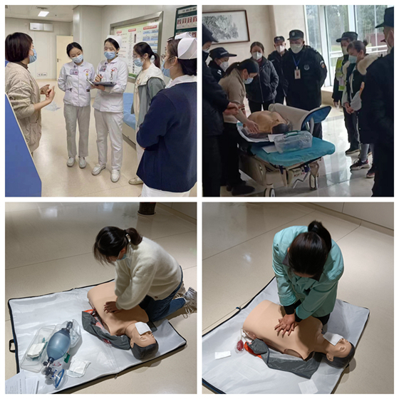 培训内容包括:一、如何判断患者意识丧失、有无自主呼吸、有无颈动脉搏动;二、胸外心脏按压的部位、深度及频率;三、开放气道以及人工呼吸或简易呼吸球囊面罩使用的注意事项;四、评判复苏有效的指征。通过一对一指导,模型操作练习,要求熟练掌握操作要领,提高门诊在各个岗位中团队协作配合的能力,严抓细节,人人考核过关。