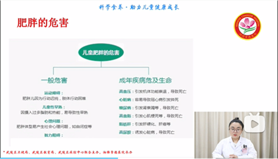 另外,为践行“科学食养,助力儿童健康成长”等理念,结合“5.20”中国学生营养日主题,由武陵区卫健局、武陵区教育局、武陵区疾控中心主办,湘雅常德医院承办的“学生营养健康,武陵在行动”活动于5月19日在武陵区共40所中小学校开展。全区4万左右中小学学生与家长一同在线上观看由湘雅常德医院儿科主治医师黄园园以《儿童青少年食养指南》为主题的视频授课。视频详细讲解了儿童肥胖类型、诊断要点、危害及干预方法等多方面知识,并提出儿童青少年食养建议,保持食物多样性,合理搭配,饮食有节,适量运动,保持体重事宜增长。