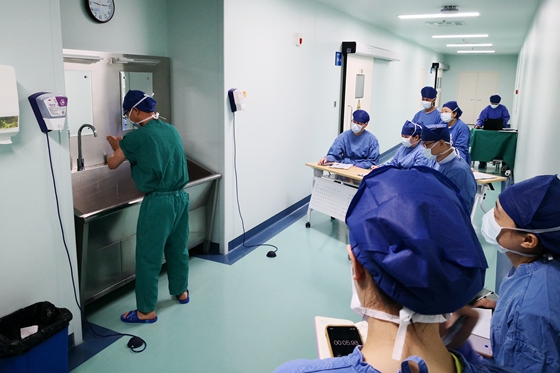 竞赛开始前,质控部主任李亮表示,外科手消毒操作是手术人员必须掌握的"三基"操作技能之一,也是预防手术部位感染,提高外科手术质量的重要操作技能之一。手卫生工作在院感防控中的重要意义不言而喻,医务人员要从病人的健康安全和自身的健康安全出发,从医院高质量发展的大局出发,要高度重视手卫生工作的重要意义,全面提高手卫生的正确性和依从性。
