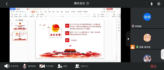 为深入倾听青年职工心声,凝聚青年力量,6月19日晚,湘雅常德医院团委以“学习二十大 筑梦向未来”为主题开展青年职工线上座谈会。各支部团干及青年职工代表参加会议。