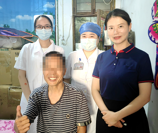 外科片科护士长金惠得知戴先生家庭经济状况一般,往返医院换药路程偏远,且患者行动不便,不能如期来院就诊。为促进患者伤口愈合,深入了解患者居家护理情况,金惠科护士长带领伤口造口师许超主管护师及孙梦护师来到戴先生家中进行慰问、伤口评估及压疮换药。