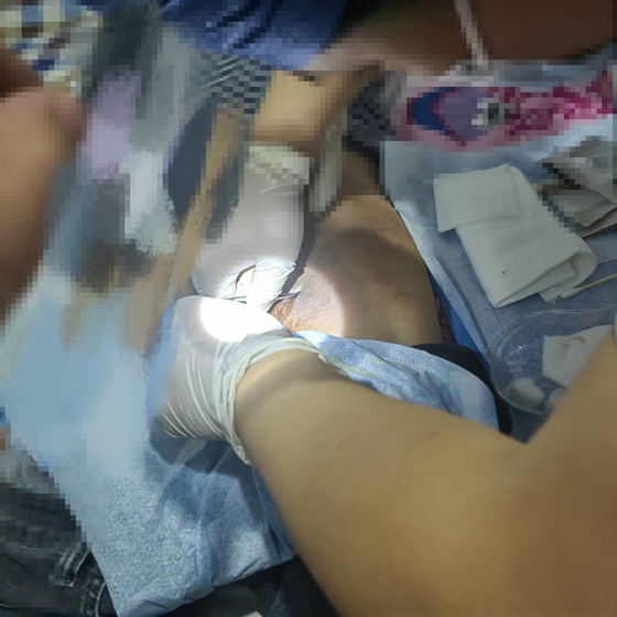 金惠科护士长关切地与戴先生妻子交谈,了解患者的生活近况及坐位时支撑垫的使用情况,评估生活自理能力和家庭支持度。许超主管护师和孙梦护师对戴先生进行全身评估和压力性损伤处伤口局部评估,患者右坐骨处压力性损伤伤口外观看仅有2.0cm×0.8cm,后经仔细查看及精准测量,伤口约2点钟位置可探及深达8cm的窦道。如此深的伤口仅靠患者居家自行换药难以愈合,且可能导致伤口感染加重、创面加深,引发脓毒血症、菌血症等危及患者生命。许超主管护师及孙梦护师在无菌操作下为患者清洗伤口后,为其进行了抗菌敷料引流、抗感染、促愈合换药处理,并告之患者家属压力性损伤患者居家护理注意事项。